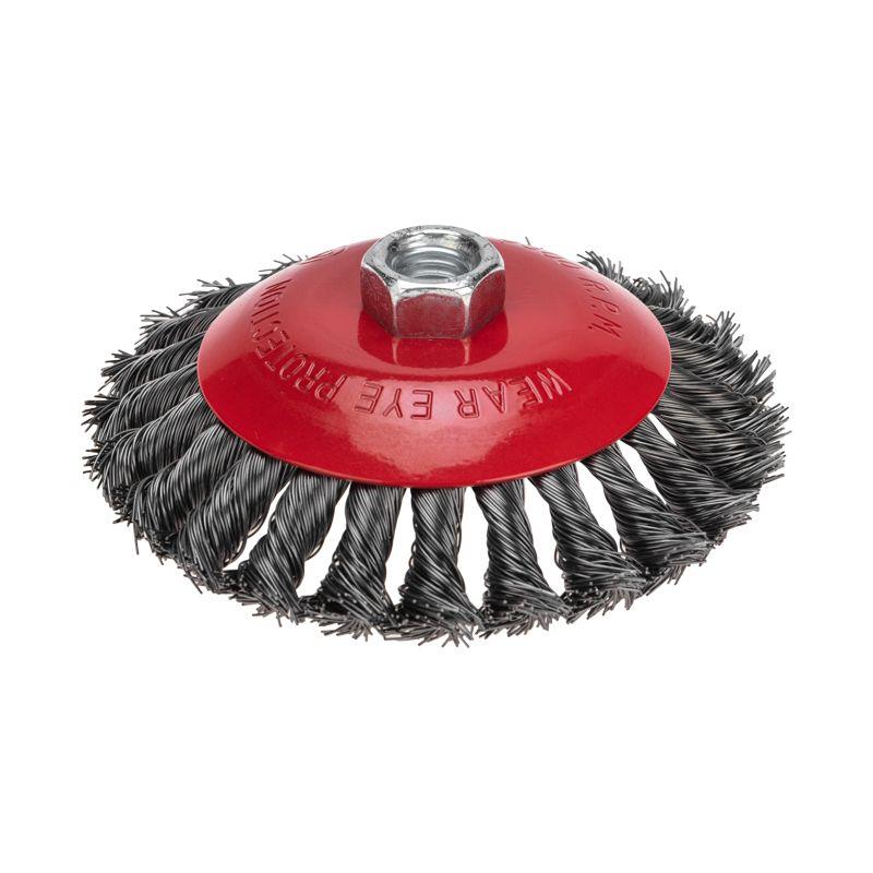 Коническая щетка KRANZ применяется в составе угловой шлифовальной машины с целью очистки разнообразных металлических деталей и заготовок от слоя краски, лака, заусенцев, ржавчины, окалины или нагара. Подходит для обработки и выравнивания сварочных швов на стальных поверхностях. Прочная закаленная проволока собрана в тугие пучки с расходящимися краями. Такой тип проволоки характеризуется жесткостью, поэтому предназначен для удаления особо сложных загрязнений. Коническая форма щетки позволяет легко достигать труднодоступных участков и обрабатывать поверхности различных форм и размеров. Инструмент подходит для выполнения работ, требующих значительных силовых нагрузок и продолжительного воздействия на загрязненную поверхность. Тип соединения М14 обеспечивает простоту и надежность установки на УШМ.