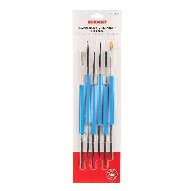 Набор для пайки (6 предметов) REXANT предназначен для монтажных и ремонтных работ с радиоэлементами на платах, в корпусах аппаратуры, в часовых механизмах и т. п. Используется в электронике, моделировании и ювелирном деле. Ручки из качественной пластмассы не растворяются в отмывочных жидкостях. В набор входит: Прижим — служит для удержания или прижимания различных элементов (резисторов, конденсаторов, микросхем и т.п.). Вилка — служит для удаления радиоэлементов с платы, вывод выдергивается при нагреве его паяльником. Другим концом можно закручивать кольца, захватывать пазом конец вывода. Крючок — предназначен для укладки тонких проводников и правильного расположения их на плате при монтаже. Шабер — нож предназначен для зачистки поверхностей от окислов и остатков припоя и флюса, а также для подрезки и зачистки проводов, дорожек на плате, удаления защитного покрытия. Шило — с одного конца цилиндрическое, с другого — 4-гранное, служит для прочистки и расширения отверстий в платах. Кисточка — для удаления остатков припоя, флюса, очистки поверхностей от окислов (бронзовая и из нержавеющей стали).
