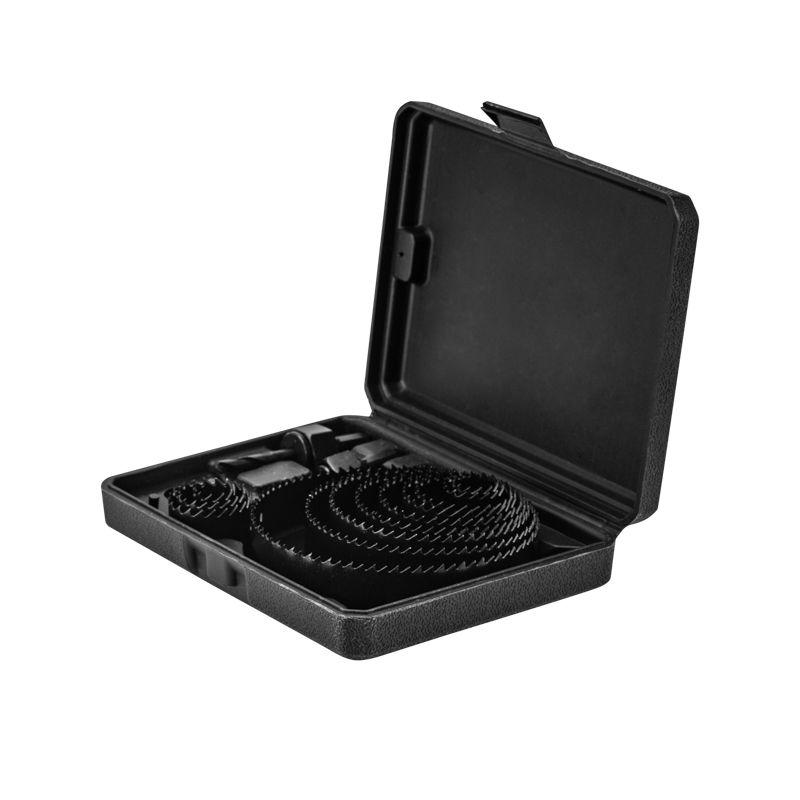Набор кольцевых пил предназначен для сверления древесины, ДСП, ДВП и пластика. Пилы применяются совместно с дрелью, станком или шуруповертом. Изготовлены из углеродистой стали, устойчивой к повреждениям, поэтому подходят для длительного использования. Зубья пил разведены, что облегчает удаление стружки и увеличивает скорость сверления. Сверление необходимо осуществлять в безударном режиме с применением СОЖ. В комплект входит центрирующее сверло, упрощающее центровку пилы, что позволяет получать отверстия правильной формы. Также в наборе предусмотрен шестигранный ключ 2,5 мм, позволяющий надежно зафиксировать сверло в державке. Соединительная резьба, дюйм: 1/2" 5/8". Набор поставляется в удобном пластиковом кейсе с ложементами, что облегчает его хранение и транспортировку. В комплектацию входят: пилы размером 19, 22, 28, 32, 38, 44, 51, 64, 76, 89, 102, 127 мм - 12 шт; хвостовики шестигранные 9,5 мм и 11 мм – 2 шт; шестигранный ключ 2,5 мм; центрирующее сверло.