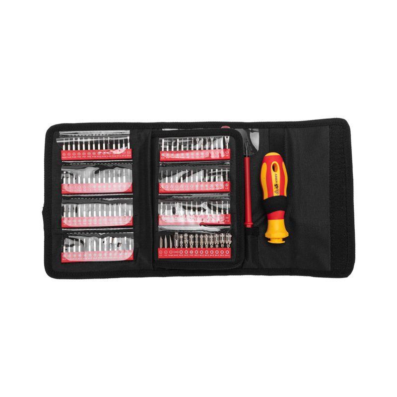Набор отверток REXANT для электромонтажных работ, монтажа/демонтажа крепежных соединений: шурупов, саморезов и т. д. Диэлектрические стержни отверток и биты, изготовленные из высококачественной хромованадиевой стали, покрыты специальным изоляционным материалом и обладают оксидированными намагниченными наконечниками. Корпус эргономичной изолированной рукоятки выполнен из пластика, не скользит в ладони, что обеспечивает дополнительный комфорт при работе. Материал стержней – хромованадиевая сталь. Материал рукояток – ABS-пластик. Набор состоит из 123 предметов. Биты: Крестовые: PH0000, PH000, PH00, PH0, PH1, PH2, PZ000, PZ00, PZ0, PZ1, PZ2; Шестигранные: H0,7, H0,9, H1,3, H1,5, H2, H2,5, H3, H3,5, H4, H4,5, H5, H6, 1/16, 1/8, 3/32, 5/32, 5/64, 7/64, 9/64; Шестигранная звезда (с отверстием): T5H, T6H, T7H, T8H, T9H, T10H, T15H, T20H, T25H; Шестигранная звезда: T1, T2, T3, T4, T5, T6, T7, T8, T9, T10, T15, T20; U-образные: U1,7, U2,0, U2,6, U3, U8; Квадратные: SQ0, SQ1, SQ2, W1,5, W2,0, W2,5; SIM выталкиватели: 0,1, 0,3, 0,8, 1,0; Tri-wing (трехлистник): Y0,6, Y1,0, Y1,5, Y2,0, Y2,5, Y3, Y3,5; Шлицевые: SL1, SL1,3, SL1,5, SL2, SL2,5, SL3, SL3,5, SL4; Pentalobe: 0,8, 1,2, 1,5, 2,0; Головки: M2,5, M3, M3,5, M4, M4,5, M5, M5,5, G3,8, G4,5, PH2; Треугольник: 2, 2,3, 2,6, 3; EX: #6, #7, #8, #9, #10; DR: #6, #7, #8, #9, #10; Специальный PH2; Спуджер; Переходник 1/4; Отвертки: PH/SL2*110, PH1*110, SL3*110, SL5*110, T15*110, T20*110, PH0*80, TRI2.3*80; Удлинитель H4*80мм; Тестер-отвертка; Рукоятка.