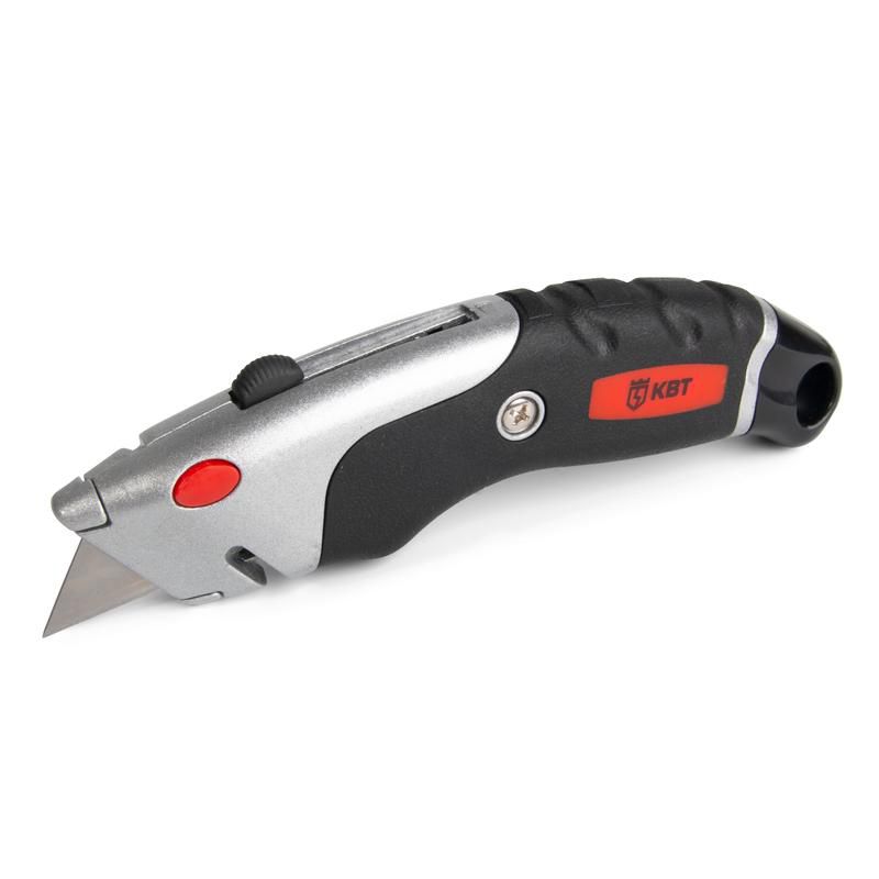 • Предназначен для резки тонких строительных материалов (бумага, картон, пластик, резина и т.д.) • Выдвижное двустороннее трапециевидное лезвие • В конструкции ножа предусмотрен стропорез • Ширина лезвия: 18мм • Материал лезвий: инструментальная сталь • Механизм быстрой смены лезвий • В рукоятке ножа находится отсек для хранения лезвий • 6 лезвий в комплекте (1+5 в отсеке хранения) • Эргономичный корпус из легкого сплава с нескользящими вставками • Корпус оснащен отверстием для подвешивания • Вес: 136г • Длина: 170мм
