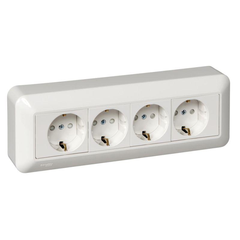 Розетка четырёхместная Systeme Electric (ранее Schneider Electric) BLANCA (открытой установки, цвет белый) с заземлением и со шторками, с монтажной стальной пластиной предназначена для сетей до 250 В на ток до 16 А. Четырёхместная розетка позволяет подключить четыре устройства в одном месте. Заземляющий контакт обеспечивает дополнительную защиту от удара электрическим током. При наличии заземления электрический потенциал уходит в землю, защищая человека. Розничная упаковка, сделано в России.