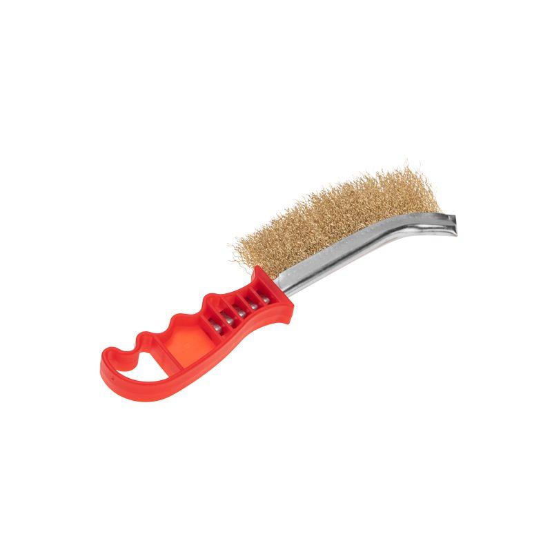 Ручная щетка используется для зачистки металлических, деревянных и других поверхностей от загрязнений, ржавчины и старых лакокрасочных покрытий. Применяется во время строительных и ремонтных работ, оптимально подходит для бытового использования. Щетка имеет изогнутый корпус, что позволяет легко обрабатывать поверхности сложной формы. Благодаря витой проволоке, изготовленный из латунированной стали, щетина сохраняет свою форму даже при сильных нагрузках. Форма проволоки и материал изготовления обеспечивают высокую эфективность и стойкую защиту от коррозии.