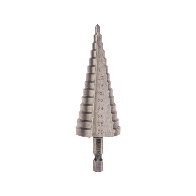 Ступенчатое сверло KRANZ применяется при выполнении монтажно-сборочных работ для сверления отверстий различных диаметров без перестановки режущего инструмента. Применяется в работе с такими материалами, как пластик, дерево, металл и др. Благодаря своей уникальной конструкции изделие заменяет целый набор традиционных спиральных сверл. Использование оснастки позволяет сэкономить время мастера, так как не требует предварительного кернения и сверления. Шестигранный хвостовик Е6,3 обеспечивает надежную фиксацию сверла во всех типах патронов шуруповертов и дрелей. Форма канавки – прямая. На каждой из 14 ступеней сверла нанесена маркировка фактического диаметра. Диапазон ступеней: 4, 6, 8, 10, 12, 14, 16, 18, 20, 22, 24, 26, 28, 30 (шаг 2 мм). Сверло изготовлено из быстрорежущей инструментальной стали (HSS) и обладает высокой прочностью, а также устойчивостью к динамическим нагрузкам и перегреву.