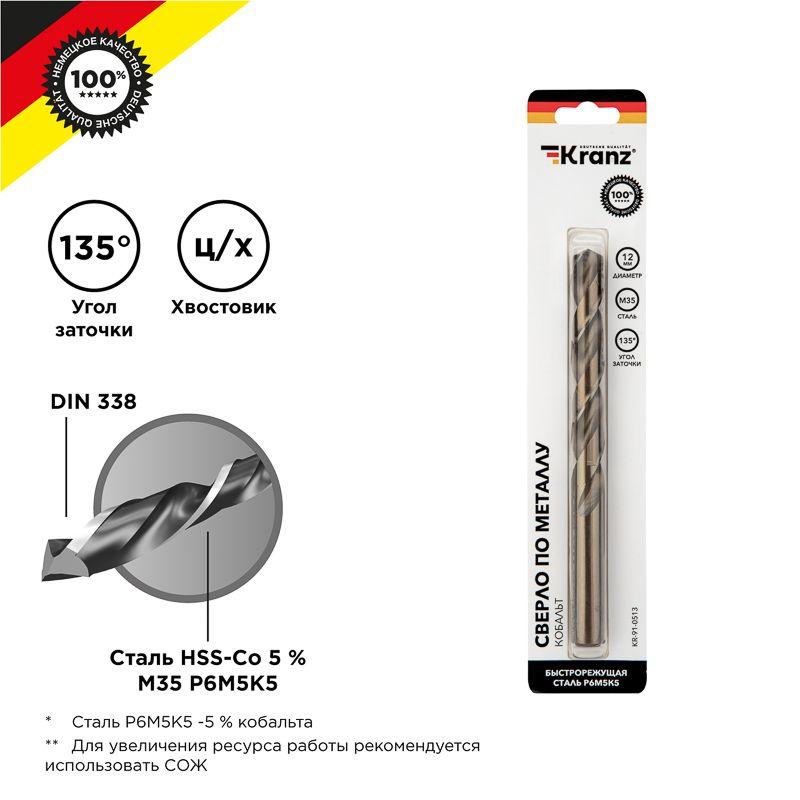 Сверло по металлу KRANZ изготовлено по стандарту DIN 338 и используется для сверления отверстий в таких материалах, как сталь, чугун, нержавеющая сталь, легированные и цветные металлы. Имеет цилиндрический хвостовик, применяется совместно с дрелями, шуруповертами и станками. Изделие выполнено из качественной быстрорежущей стали М35 (Р6М5К5) с добавлением 5% кобальта, что обеспечивает стойкость к перегреву, долгий срок службы и высокую эффективность. Благодаря заточке режущей части под углом 135 градусов достигается более эффективный вход оснастки в материал, что приводит к увеличению ресурса эксплуатации и сокращению износа сверла. Благодяря вышлифованному профилю сверло сохраняет точное положение во время сверления, что гарантирует получение ровных и аккуратных отверстий без трещин и сколов.